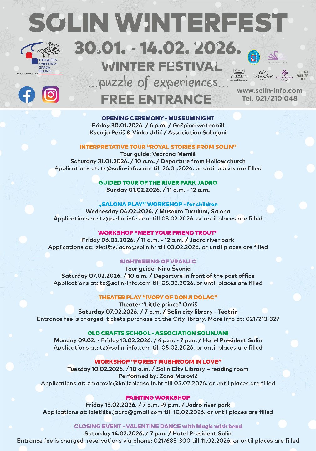 È un progetto di un festival invernale che attraverso 4 diversi argomenti mostra tutto il patrimonio culturale, naturale e religioso della città di Solin ai concittadini e ai visitatori delle città circostanti, nonché ai turisti e come la città più giovane della Croazia indica importanza della famiglia e della vita. Pertanto, oltre a educare i suoi concittadini (bambini e adulti) e progettare strutture culturali durante i mesi invernali, questo progetto è progettato per sviluppare l'offerta turistica della bassa stagione e posizionare la città di Solin come una destinazione che vive 365 giorni all'anno, in coerenza con gli obiettivi strategici di sviluppo turistico.